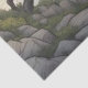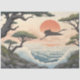 This tissue paper is a Japanese-style landscape print that draws inspiration from the Ukiyo-e and Shin-hanga artistic movements. It features classic elements like a silhouette of a great egret flying across a large red sun, gnarled pine trees framing the scene, and stylized ocean waves crashing against a rocky shore.