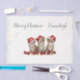 Três gatinhos adoráveis com chapéus de elfo vermelho posando com ornamentos ruivos, coloca este design para toda a beleza. Faça sua saudação personalizada bem acima dos gatinhos. Uma borda de neve sobre fundo branco e duas pequenas pegadas no canto superior esquerdo.