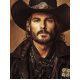 A imagem mostra uma pessoa vestida de roupa preta que se parece com um advogado ou xerife do Velho Oeste. O indivíduo está vestindo um chapéu preto largo, adornada com uma banda decorativa de prata com um design circular ornamentado na frente. O traje inclui um casaco preto com padrão texturizado, um cachecol preto com sotaques prateados e um crachá fixado ao casaco, o que sugere uma posição de autoridade, como um xerife ou um advogado. O olhar global lembra um personagem ocidental histórico ou ficcional, fazer interessante pelo seu disfarce detalhado e específico do período. Lawman de roupa preta, chapéu largo, banda prateada, casaco preta, padrão texturizado, crachá xerife, personagem ocidental.