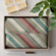 Colorful stripes to compliment whimsical Kitschy Santa and Ornaments pattern which exudes playful nostalgia, transporting you to a bygone era of holiday cheer. The background is a warm, creamy beige reminiscent of vintage parchment, allowing the vibrant illustrations to pop with festive merriment.