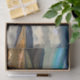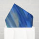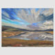 Uma design de arte de um lago com o dramático céu refletido na água do lago. Colinas e campos circundam o lago.