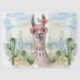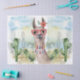 Lama de aquarela doce com flor e decoração no pescoço. O fundo é uma paisagem desértica