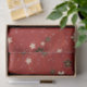 Fundo vermelho com delicadas linhas onduladas, adornadas com flores pretas e brancas em um padrão disperso, exalando um senso de elegância e harmonia.