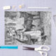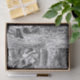 Este papel tecidular para o seu presente tem um desenho preto e branco vintage de uma pequena capota de equitação vermelha vestindo seu carregando capuz uma cesta e buquê de flores parando para falar com o lobo na floresta.