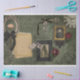 Colagem única de efêmeras funerárias vitorianas e memento mori, incluindo o rosto antigo do relógio, fotos enquadradas, flores secas, pergaminho, chaves antigas, lírios, rosas escuros e fitas sobre fundo verde angustiado com roldanas elegantes e damasco curado. Adequado para projetos de dissociação do Halloween.