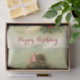 Design de aniversário do estilo vintage, engraçado, com um monograma com uma garotinha segurando o bouquet de rosa.
