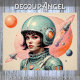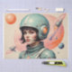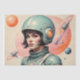 Uma representação na moda de uma mulher com um terno espacial elegante e capacete, colocada contra um fundo rosa. O design incorpora a estética da Era Atômica, misturando elementos retro-futurísticos com influências modernas do médio. Foguetes e motivos abstrato celestes reforçam o sentimento de otimismo e exploração, refletindo o fascínio da era pela viagem do espaço.