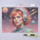 Um retrato chico de uma mulher vestindo fones de ouvido futuristas, contra um fundo rosa vibrante. Esta design inspirada na Idade Atômica combina a estética moderna do médio com elementos retro-futuristas. Os motivos espaciais e as formas dinâmicas suscitam o entusiasmo da era espacial, refletindo o otimismo e o fascínio da era pelo cosmos