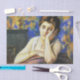 Este design apresenta uma pintura do Impressionista Italiano Federico Zandomeneghi (1841-1917). Mostra uma jovem elegante que se inclina contra o fundo de uma cadeira. Ela tem a mão descansando na cabeça e ela está suavemente sorrindo. A mulher tem cabelos de morena e olhos azuis. Ela está sentada em uma sala com papel de parede de cor brilhante. Parece que há uma lareira atrás dela.