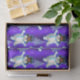 Um papel de embrulho de Natal para crianças bonitinho e colorido com um adorável padrão de bonecos de neve, todos vestidos de chapéu com lenços, dançando. Há pequenas flores de neve ao redor delas, e árvores prateadas de Natal brancas. Este papel branco, azul e branco, de Natal seria ideal para embrulhar presentes infantis, ou apenas para quem ama coisas bonitinhas.