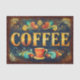 Vintage Coffee Typography Sign with Ornate Gold Lettering and Retro Teal Background, decorative café style artwork for decoupage and furniture upcycling. This bold and decorative coffee design features large antique gold lettering set against a rich distressed teal background. Ornate flourishes in warm coral, turquoise, and muted gold frame the composition, giving it a classic café sign aesthetic with a handcrafted vintage feel.
