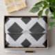 Um padrão ousado e geométrico de grandes e pequenos diamantes negros em um fundo branco. O branco forma uma trava que separa as formas de diamante. Imagem criada digitalmente. Copyright © Claire E. Skinner, Todos os direitos reservados.