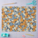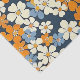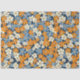 Um padrão floral vibrante cobrir toda a imagem. Flores pequenas e estilizadas em tons de laranja, azul claro e esbranquiçado são dispostas densamente sobre um fundo azul marinho. As flores têm um aspecto ligeiramente imperfeito, pareceria, com variações na saturação e forma das cores que dão ao padrão um aspecto texturizado, quase pintado à mão. O padrão repetido cria um efeito visual alegre e ocupado.