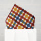 Este lenço apresenta um padrão de xadrez em amarelo, laranja, vermelho e azul sobre um fundo branco.