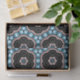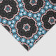 Padrão decorativo sem costura com formas geométricas em preto sobre fundo azul e branco.