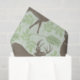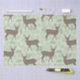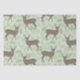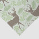 Veado com galhadas, a silhueta é colocada sobre fundo verde em apuros com folhas compostas flutuantes e agulhas de pinho em padrão repetitivo.