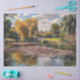 Pintura paisagística num estilo impressionista de salgueiros chorões na margem de um lago com almofadas de lírios.