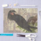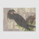 Um grande papagaio preto e samambaia verde sobre um fundo de jornal antigo e sotaque de damasco dourado.