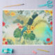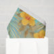Elegante tropical inspirou papel de dissociação/tecido. Papagaio azul salpicado entre as flores tropicais, folhas apoiadas em pano de fundo amarelo azul.