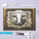 Vaca primitiva de fazendeiros russos em um quadro de janela com flores desentupem papel de tecido com pintura primitiva de vaca, no estilo de arte primitiva, retrato ilusório e casa de fazenda.
