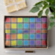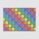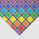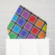 Arte abstrato digital de quadrados coloridos arco-íris contra fundo preto com o que parece ser arranhões brancos a dentro de cada quadrado.