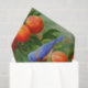 Dois pássaros azuis ocidentais percham numa árvore de pêssego, enquanto um terceiro pássaro azul se senta num cesto cheio de fruta recém-colhida pronta para comercialização. Trabalho de arte realista criada de uma pintura original de petróleo pelo artista da vida selvagem Crista S. Forest.