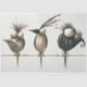 Apresentando o Stark Perch Trio, um grupo de três aves estilizadas poleiradas em um arame, cada uma com suas características únicas e exageradas: Pássaro da Peste Spiky: O pássaro da esquerda tem penas longas e pontiagudas saliindo da cabeça e da cauda, parecendo-se com uma explosão de linhas, dando-lhe uma aparência dramática e suja. Pássaro Surpresa Disparado: A ave do meio é esbelta com faixas verticais e tufos de penas grudados no topo da cabeça, dando-lhe um olhar surpreso e peculiar. Pássaro Cômico Plump: O pássaro à direita é repleto de grandes olhos redondos e um pequeno bico, o que lhe dá uma expressão meio cômica e carinhosa. Colocadas sobre um fundo simples, as feições estreladas e exageradas dessas aves criam uma cena visualmente impressionante e caprichosa.