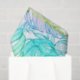 Um bonito pastel, aquarela, parece impressão de folha de palma. Em cores de turquesa, verde, cor-de-rosa-coral num fundo branco. Luz, areia e elegante.