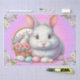 Um belo coelho branco da Páscoa está pronto com uma cesta de ovos pastéis de Páscoa e flores de primavera está pronto para se esconder na manhã da Páscoa. Este lenço é perfeito para presentes ou para artesanatos como a desvinculação.