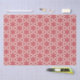 O padrão apresenta um design simétrico, repetindo com um motivo floral ousado. Consiste em formas em duas cores principais: um vermelho coral profundo e um fundo rosa pálido. O elemento central é uma flor grande, estilizada, com seis pétalas em vermelho-coral. Ao redor desta flor estão formas geométricas adicionais, incluindo formas semelhantes a pétalas e poligonais, criando um design equilibrado e harmonioso. O fundo cor-de-rosa claro fornece um contraste suave, fazer as formas vermelhas do coral se destacam de forma destacada.