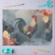 This tissue paper sheet features a red, white, blue and gold rooster against beautiful, stylized flowers, leaves, and botanical elements. Watercolor paint strokes and gold dots add color and interest.