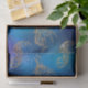 Coleção de peixes dourados feitos de brilho num fundo brilhante de azuis claro e escuro. Excelente para trabalho de arte de desacoplamento, artesanatos de papel ou encapsulamento de presente.