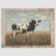 Uma representação encantadora de uma vaca negra e branca em pé em meio a um prado iluminado pelo sol, capturada em um estilo de pintura rústica vintage. O quadro texturizado de madeira complementa a cena pastoral idílica.