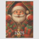Rendered in vibrant digital art with semi-realistic, cartoon-style shading, Santa’s jolly face, fluffy beard, and golden zipper details pop against a red and green tartan background surrounded by pinecones, holly berries, and wrapped Christmas gifts.