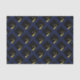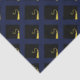 Tecido decorativo de decoração de presentes e formandos de graduação criativa com padrão de boné de formatura preto e dourado sobre fundo azul marinho.