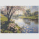 Folha de papel de tecido com uma árvore florida rosa próxima a um rio. Uma bela paisagem inspirada na primavera em grande escala para projetos de artesanato de desacoplamento de móveis.
