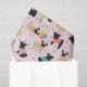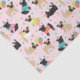 Bela festa de aniversário Pug dog com casacos pretos e bronzeados vestidos de bonitinha de aniversário com balões, bolo e padrão de confete.