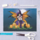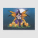 A bruxa-fada cabeleira, corajosa, toda em roxo, sentada entre uma mancha de abóbora durante uma lua de cheio com seu pequeno gato preto.