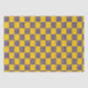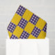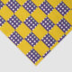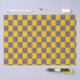 Um padrão de quadrados amarelos e azuis alternados cria um efeito tabuleiro de xadrez. Os quadrados azuis são pontilhados com círculos brancos, adicionando um contraste lúdico ao amarelo brilhante.