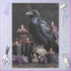Um corvo estrelado sobre um crânio humano, cercado por velas brilhantes e cristais ametistas.