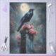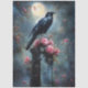 Uma ravena em greve fica sobre uma tombstone coberta de musgo cercada por rosas rosa vibrantes, enquanto a lua de cheio ilumina a cena serena e mística.
