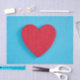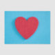 Este design apresenta uma imagem de um coração vermelho brilhante que foi originalmente feito de feltro; é colocado sobre um fundo azul claro.