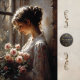 Rose Reverie Woman features a softly painted vintage-style portrait of a young woman cradling blush pink roses, wrapped in warm light and gentle shadow. The palette is muted and romantic, with painterly textures that feel aged, graceful, and deeply human.