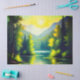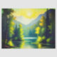 Bonito e bela pintura em aquarela com Sunrise sobre as montanhas e Chá do lago Cortina