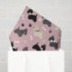 Cute black, gray and wheaten Scottie dogs wearing bows, with pawprints and dog bones on a pink background.