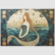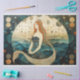 Mulher de Cabelo Vermelho Longo Transforma-Se Numa Cauda De Peixe, Pintura Primitiva Celestial Apresentando Uma Noite Luar Com Uma Bela Sereia No Oceano. No estilo da arte primitiva, retrato ilusório, paisagem marinha.