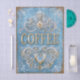 A soft shabby chic Coffee typography design featuring ornate hand-painted scrollwork and floral flourishes set against a weathered powder blue background. The central word is displayed in classic serif lettering with a lightly distressed, vintage finish, framed by symmetrical decorative motifs that evoke antique French café signage. Subtle brush textures, faded edges, and chalky paint effects give the artwork a gently aged appearance, making it ideal for elegant yet relaxed decoupage projects. The calm color palette allows this design to blend beautifully with neutral, coastal, farmhouse, and vintage-inspired décor. Artwork similar to hand-painted decorative sign art or vintage-style folk painting……COLOR COMBINATIONS: Powder blue, ivory, white, gold, taupe, beige…..PERFECT FOR: Decoupage artists, furniture upcycling projects, kitchen décor, cafe themed crafts, farmhouse interiors, shabby chic decor, mixed media art, cabinet doors, trays, drawer fronts, journals, creative craft projects, gift wrapping for coffee lovers..….🖤 NOTE 1. The 18 lb tissue is a great choice if you like a little extra strength—it's easier to handle, resists tearing and allows for gentle repositioning. It’s also more opaque, making it perfect for darker surfaces. The 10 lb tissue is wonderfully lightweight and flexible giving you that smooth, blended finish. It’s ideal for layering on furniture or smaller projects so treat it gently and it will reward you with stunning results!