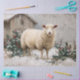 A fluffy sheep stands peacefully in a snowy field surrounded by holly bushes and a rustic barn, creating a serene winter countryside setting perfect for holiday and nature themes.