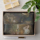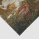 This design features a painting by the Victorian-era British artist Edward Frederick Brewtnall (1846–1902). It is a richly detailed Pre-Raphaelite-influenced painting that illustrates a key moment from the classic fairy tale: the princess lying in her enchanted sleep, surrounded by layers of wild roses that have grown over the palace during her hundred-year slumber. The roses add both beauty and danger to the scene: delicate blossoms contrast with the sharp thorns, symbolizing the enchantment’s mixture of protection and peril. Their encroachment also heightens the sense of isolation, as if the outside world has vanished behind a barrier of living bramble. Sleeping Beauty lies gracefully on an ornate bed draped in rich fabrics, her body relaxed and her expression serene. The soft lighting creates a warm glow around her figure, giving her an almost ethereal presence. Brewtnall emphasizes her stillness and her perfect calmness, suggesting both innocence and a dream world untouched by the passing of time. Brewtnall’s meticulous attention to detail, typical of artists influenced by the Pre-Raphaelite movement, enriches the scene. Every fold of fabric, every rose petal, and every carved surface is rendered with care, drawing viewers into a world that feels tangible yet dreamlike. The painter's palette (warm browns, deep greens, soft pinks, and glowing golds) reinforces the atmosphere of magical stillness. The long-awaited prince can also be seen as he finally reaches the enchanted princess. The prince, dressed in rich medieval garments, ascends a small flight of steps leading to her bed. Brewtnall paints him with a mixture of awe, caution and earnest devotion. He gazes directly at her face, transfixed by her beauty and by the profound importance of this moment. His body leans forward slightly, hesitant but resolute, capturing the tension of a man on the cusp of breaking an ancient spell. He is not yet touching her; the scene is suspended in that breath of time before action, adding emotional and narrative intensity. The Prince holds a spear in one of his hands, suggesting that he has had to fight to reach Sleeping Beauty. What makes Brewtnall’s version especially compelling is that he does not rush toward the dramatic climax. Instead of showing the awakening kiss, he invites the viewer into the contemplative moment just before it occurs. He is both intruder and saviour, the first living soul to enter the room in a hundred years, standing before a woman whose life is suspended like a musical note held indefinitely. The roses that surround Sleeping Beauty are not simply background decoration. They behave almost like characters. Their vines creep over bedposts, crawl across steps, and clutch at the prince’s approach with curling tendrils. The thorned vines form natural barriers, as though the castle has tried for decades to shield her, preserve her or discourage the unworthy. They frame her bed like an organic cathedral altar, and the prince climbs toward it as if moving through a sacred ritual space. The original artwork depicting Sleeping Beauty was painted by Edward Brewtnall sometime before 1902.