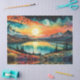 Os sóis erguem-se como a lua sobe sobre as montanhas, um lago de montanha e uma flora colorida arte AI por minx267